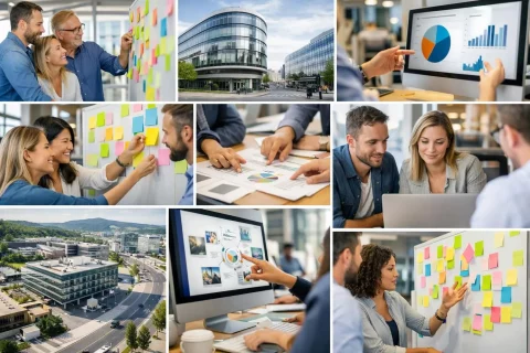 Collage de photos montrant une équipe créative à Crissier, illustrant comment choisir la meilleure agence de communication.
