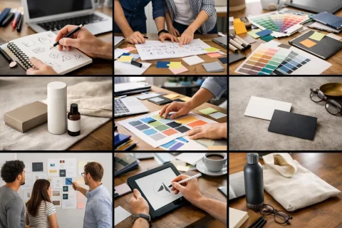 Collage visuel d'éléments de marque (couleurs, croquis, produits) illustrant la création charte graphique entreprise.